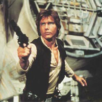Read more about Han Solo at: Wikipedia Official Site: Lucasfilm Han Solo, played by Harrison Ford, is a fictional smuggler and "reckless mercenary" in the Star Wars franchise. Introduced in the film Star Wars Episode IV: A New Hope (1977), Solo and his Wookiee first mate, Chewbacca (Peter Mayhew), become involved in the Rebel Alliance against the authoritarian Galactic Empire. Over the course of the Star Wars franchise, Solo becomes a chief figure in the Alliance and succeeding galactic governments. Star Wars creator George Lucas described Solo as "a loner who realizes the importance of being part of a group and helping for the common good." Han remains one of cinema's most revered movie characters. The American Film Institute ranked Solo as the 14th greatest film hero. He was also deemed the 4th greatest movie character of all-time by Empire magazine. Entertainment Weekly ranked the character 7th on their list of The All-Time Coolest Heroes in Pop Culture. On their list of the 100 Greatest Fictional Characters, Fandomania.com ranked Solo at number 15. At the beginning of A New Hope, Solo and Chewbacca are desperate to pay off a debt to Jabba the Hutt. Solo accepts a charter to transport Obi-Wan Kenobi (Alec Guinness), Luke Skywalker (Mark Hamill), C-3PO (Anthony Daniels), and R2-D2 (Kenny Baker) to Alderaan in Han's ship, the Millennium Falcon; when they arrive, they find Alderaan has been destroyed by the Death Star, and the Falcon is captured. Enticed by the likelihood of a substantial reward, Solo and Chewbacca help Skywalker rescue Princess Leia (Carrie Fisher), held captive aboard the station. After escaping and delivering Skywalker, Leia, and the droid to the Rebels, Solo and Chewbacca receive payment for their services and depart; Solo believes the Rebels' plan to attack the Death Star is "suicide." However, Solo soon has a change of heart and returns to aid in the attack, ultimately enabling Skywalker to fire the shot that destroys the Death Star. Following this, Han accepts a position as Captain with the Rebel Alliance. When the Empire attacks the Rebels' base on Hoth in The Empire Strikes Back (1980), Solo transports Chewbacca, Leia, and C-3PO to Cloud City for safety and repairs to the Falcon. The bounty hunter Boba Fett (Jeremy Bulloch) tracks the Falcon to Cloud City, and Darth Vader (David Prowse/James Earl Jones) forces Cloud City's administrator, Lando Calrissian (Billy Dee Williams), to help capture Solo. Leia confesses her love of Solo shortly before he is frozen in carbonite for delivery to Jabba the Hutt. Although Calrissian helps free Vader's other captives, they do not succeed in releasing Solo. However, Leia infiltrates Jabba's palace at the beginning of Return of the Jedi (1983) and frees Solo. Reunited with the Rebels, Solo rejoins the Alliance and is commissioned as a general. Along with Leia and Chewbacca, he leads a team in deactivating the shields protecting the Empire's second Death Star. Aided by the indigenous Ewok, Solo and the Rebels succeed in overcoming the Imperial garrison, allowing the Rebels' space forces to destroy the Empire's battlestation.