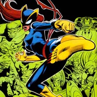 Read more about Hellcat at: Wikipedia Official Site: Marvel Entertainment Hellcat (Patricia "Patsy" Walker) is a fictional character published by Marvel Comics. She premiered as the star of a teen romantic-comedy series and was later integrated into Marvel superhero franchises such as the Avengers and the Defenders. Created by Ruth Atkinson, Patsy Walker first appeared in Miss America Magazine #2 (Nov. 1944), published by Marvel precursor Timely Comics, and became Hellcat in The Avengers #144 (Feb. 1976). Redheaded Patsy Walker, her parents Stanley and Betty, her boyfriend Robert "Buzz" Baxter, and her raven-haired friendly rival Hedy Wolfe appeared from the 1940s through 1967 in issues of Miss America, Teen Comics, Girls' Life, and namesake series Patsy Walker and its spin-offs: Patsy and Hedy, Patsy and Her Pals, and the single-issue A Date with Patsy. These were popular teen-humor comics from Marvel's 1940s and 1950s predecessors, Timely Comics and Atlas Comics, respectively. Attesting to its quiet popularity, Patsy Walker (along with Millie the Model and Kid Colt, Outlaw) was among the very few titles published continuously by Marvel from the Golden Age of Comic Books. Future Mad Magazine cartoonist and "Fold-In" creator Al Jaffee wrote and drew most of the early issues — which, given the tone and the target audience, incongruously included Mad founding editor Harvey Kurtzman's bizarre "Hey Look!" one-pagers in several. Jaffee was succeeded by Al Hartley, who would go on to Archie Comics and produce many Christian comic books starring Archie characters and others. Morris Weiss drew Patsy and Her Pals. Millie (the Model) Collins made guest appearances in #92 and 98.