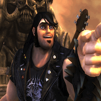 Read more about Eddie Riggs at: Wikipedia Official Site: Double Fine Brütal Legend (stylised with a metal umlaut) is an action-adventure/real-time strategy game created by Double Fine Productions and published by Electronic Arts for the PlayStation 3 and Xbox 360. The game was released during October 2009 in North America and Europe. Though Brütal Legend was originally to be published by Vivendi Games prior to its merger with Activision, Activision had dropped the game from its portfolio after the merger. It was later picked up by Electronic Arts, though Activision and Double Fine brought counter-lawsuits against each other over publishing issues. The issues were settled out of court. Brütal Legend was generally well-received by game reviewers, praising Schafer's vision and writing of the heavy metal-inspired world, and the performances of the voice cast, particularly Black and Osbourne. Many found the hybrid gameplay of action and real-time strategy games did not mix well, however, blaming console control limitations and missing features normally found in games of either genre. Brütal Legend is a third person action/adventure game incorporating real time strategy elements. These tools can be used in combination with each other to take out Eddie's foes; for example, the player can use his guitar Clementine to create pyrotechnics to launch a foe into the air and follow up by attack it with the Separator ax. In a case of a specific boss fight, the player must use the Deuce hot rod to lure the boss to a spiked gate held up by counterweights, and then play the "Earthshaker" move on Clementine to destroy the weights and sever the creature's head. Within the open world, the player can use a map and the Deuce's turn signals to guide them towards either story-advancing missions or side missions. Side missions include hot-rod races against a demon, defending Eddie's allies from a pending attack, or helping a cannon operator spot his targets. There are about 23 main missions in the story with 30 side missions that the player can optionally take. The player can also explore the game's world to find statues bound in leather or chains that can be freed to gain a health boost for Eddie or to reveal part of the game's backstory, and can look through special telescopes at vistas or complete certain jumps to earn additional Fire Tributes. The player can also find monuments they can raise that unlock an additional heavy metal song from the game's soundtrack that can be played on the Deuce's radio, "The Mouth of Metal"; the player can further customize its set list with songs they have been rewarded with or have collected.