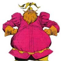Read more about Volstagg at: Wikipedia Official Site: Marvel Comics Volstagg is a fictional character, a charter member of the Warriors Three, a trio of Asgardian adventurers and supporting cast of Thor in the . He is not taken from mythology but an original creation, inspired by Falstaff. Stan Lee admitted his Asgardians spoke an English halfway between Shakespeare and the King James Bible. Volstagg's origin beyond being a member of the Asgardian race, a warrior and adventurer, and a friend of Thor has not been revealed. Volstagg is fairly advanced in age for an Asgardian, and it has been suggested that he was a highly respected and feared warrior in his prime. In a sense, Volstagg's entire career has been one long origin story. The character was first introduced in a "Tales of Asgard" filler in Journey Into Mystery, the magazine carrying Thor's Asgardian adventures. As originally envisioned by Jack Kirby, Volstagg was a huge, bumbling oaf much given to boasting and bragging: the last into battle and the first to claim victory (usually undeserved). Referring to himself as "The Lion of Asgard," he usually caused more problems than he solved and seemed totally unaware of the chaos that almost always followed in his wake. A flashback revealed in Captain Marvel #42 tells how a drunken Volstagg incurred the wrath of Odin by spilling the secrets of the first Frost Giants to a younger Thor. Strangely enough, he was considered a trusted and worthy comrade by his closest friends and allies, Fandral the Dashing, Hogun the Grim, and Thor. In his first appearance, Volstagg joined with the Warriors Three in Thor's quest for the power that had cracked the Odinsword of Asgard. Volstagg then helped repel the attack of the Flying Trolls of Thryheim, although he cowered for a lot of the fight, helped defeat the forces of Harokin, was lured into a trap by the dragon Fafnir, and defeated Mogul of the Mystic Mountain.