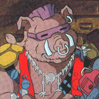 Read more about Bebop at: Wikipedia Official Site: Fred Wolf Films Bebop and Rocksteady are fictional characters in the 1987 Teenage Mutant Ninja Turtles cartoon series and the Archie TMNT Adventures comics as well as most of the classic TMNT video games. They follow the orders of series villain The Shredder, leader of the Foot Clan. Their names are both from genres of music: bebop is a style of jazz; while rocksteady is a Jamaican music style, a precursor to reggae. Bebop and Rocksteady were originally human, part of a street gang in New York City that was employed by Shredder. Rocksteady was originally a short and stocky blond Caucasian man (who sported army camouflage pants that would be replaced with simple beige cargo pants later while also occasionally sporting a strong Army helmet on his head in his mutated form). Bebop was a taller African American man with a purple mohawk. With the other members of their gang, they were sent out to stop a Channel 6 reporter named April O'Neil from doing a report about crime in the city. April ran down into the sewers while being chased by the street gang and met the Teenage Mutant Ninja Turtles, who then defeated the gang in a fight. After this humiliating setback, The Shredder developed a plan to defeat the Turtles by mutating members of the street gang, so that they would have abilities parallel to the Turtles'. Bebop and Rocksteady both volunteered to undergo the procedure (though neither was particularly aware of what it would entail) with the promise that it would allow them to exact revenge on the Turtles. Bebop was mutated into a human warthog, and Rocksteady into a rhinoceros. However, though the transformation did make them larger and stronger, they remained incompetent simpletons and were completely inept at stopping the Turtles or carrying out Shredder's plans. For example, in "Enter the Shredder" they charged at the Turtles, who jumped, and crashed into each other. Donatello commented that their mutations didn't "up their IQ's any." For most of the series they were employed for purposes however, the Turtles certainly consider them to be formidable (despite their stupidity) in combat due to their great strength and endurance, and as such, often use their intelligence to outwit them rather than fighting them in a straightforward manner. In one episode of the series, Bebop was shown to have kept a pet turtle, which got mutated into the evil turtle Slash. Bebop and Rocksteady's last appearance is in the season 8 finale [http://www.ninjaturtles.com/cartoon/guide/cart178.htm Turtle Trek]. In that episode, the Turtles destroy the Technodrome's engines, trapping it and its inhabitants in Dimension X for good. Bebop and Rocksteady are never seen again after that episode, but Krang and Shredder return during the 10th and last season. Bebop and Rocksteady are presumed to still be somewhere in Dimension X.