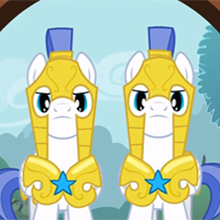 Read more about Royal Guards at: Wikipedia Official Site: Hasbro My Little Pony: Friendship Is Magic is an animated television series that premiered on October 10, 2010, on the United States cable network The Hub. It is based on Hasbro's My Little Pony line of toys and animated works. The series is produced by Hasbro Studios and DHX Media Vancouver (formerly Studio B Productions). , the show is in its second season in the United States, and is broadcasting internationally in dozens of countries in over ten languages. The show follows a studious unicorn pony named Twilight Sparkle as her mentor Princess Celestia guides her to learn about friendship in the town of Ponyville. Twilight becomes close friends with five other ponies: Applejack, Rarity, Fluttershy, Rainbow Dash, and Pinkie Pie. Each represents a different facet of friendship, and discovers herself to be a key part of the "Elements of Harmony". The ponies share adventures and help out other residents of Ponyville, while working out the troublesome moments in their own friendships. The show has been critically praised for its humor and moral outlook. Despite the target demographic of young girls and their parents, Friendship Is Magic has gained a large following of older viewers, predominately male teenagers and adults, who call themselves "bronies". Reasons for this unintended appreciation include Faust's creative contribution to the writing and characterization, the expressive Flash-based animation style, themes that older audiences can appreciate, and a reciprocal relationship between Hasbro, the creators, and the fans. Elements of the show have become part of the remix culture and have formed the basis for a variety of Internet memes. The show has prompted a fan convention known as BroNYCon. Hasbro, Inc. has produced several generations of toys and entertainment related to the My Little Pony franchise, often labeled by collectors as Generations 1 through 3. The animated cartoon series My Little Pony Tales, produced in 1992, was the toy line's most recent television series before Friendship Is Magic, and it featured the pony designs of the first generation. It was followed by various direct-to-video releases, which featured later designs up to the third generation. Just as Michael Bay's film had helped to boost the new Transformers toy line, Hasbro wanted to retool the My Little Pony franchise and update it to better suit the current generation of young girls. According to Margaret Loesch, CEO of The Hub, revisiting properties that had worked in the past was an important programming decision, influenced to an extent by the opinions of the network's programming executives, a number of whom were once fans of such shows. Senior Vice President Linda Steiner also stated that they "intended to have the show appeal to a larger [demographic]", with the concept of "co-viewing" of parents with their children a central theme of the Hub's programming. No match records for this character. No match records for this character. |