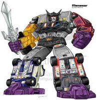 Read more about Menasor at: Wikipedia Official Site: Hasbro The Stunticons are fictional characters from the Transformers storyline. They a group of Decepticon feared for their psychotic behavior and their capability to do death-defying vehicular stunts and wreak havoc on the streets. They combine to form a powerful giant robot called Menasor (Pentacar or Ultrax in Italy). They were called Stuntrons in Japan and Cascadicons in France. They were introduced into the Transformers toyline in late 1985 and were sold as a Menasor gift set, and then sold separately in 1986 in most department stores (e.g., Toys R' Us, Sears, Target, Kay-Bee Toys). Their enemies are the Aerialbots. The Stunticons were mistakenly billed as Autobots when their toys were released in Italy. :The combined form of the group of five Decepticon known as the Stunticons. :He is immensely powerful, capable of delivering a punch with the force of 140 tons. :He uses Motormaster's cyclone gun to blow through Autobot barriers and carries a silver ionizer sword with a charge of 50,000 volts.