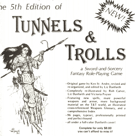 Role-playing games were pretty big at that time. My friends and I had tried to do Dungeons and Dragons, but the advanced version was kind of a complicated game. At some point, somebody brought in a game system called Tunnels and Trolls, which was pretty easy to play and left plenty of room for improvisation. Better yet, it came with something called Solo-Dungeons, which meant that nobody had to Game Master a session... we could just kind of play against the book.