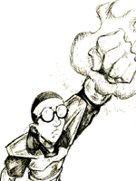 | His name is Simon Crook. For a Great while he has ignored the fact that his best friend is compleatly, irredeemably evil. That's to be expected though, for, Simon is an expert at ignoring things. After all, until recently the safety of everthing within a 30 foot radius depended upon his ability to ignore distraction. In any event, the tactic hadn't given him any problems for a good long time. He and Pete had wandered the multiverse togeather, meeting interesting creaturs and seeing the sites. They'd been accepted by prestigious organizations and had had deep conversations with beings previously beyond their imagining over tosted marshmellows. Fundamental alignment questions simply couldn't come between friends such as they. At least, that's the Way it seemed until a couple of weeks ago. It started when Simon forgot to arrange transportation to their next destination. Perhaps it was a lapse in his training in reverse concntration. In any event, stranded in an alien desert, Pete lost his temper and tried to hijack a truck. Simon tried to stop him, but Pete refused to be talked down. He accused Simon of being vacant, and stupid, and coddleing towards weaklings. Simon made some disparaiging comments about Pete's moral compass. Eventually, the situation degenerated into a full fledged battle. The hijacking was forgotten as two who had been friends tore into each other. Conflict that had bubbled beneath the surface for years came to the fore. The physical and astral planes were ravaged as Simon physically attacked his invulnerable foe, and Pete mentally assaulted a psionic untouchable. Somehow, one of Pete's psibolts managed to hit Simon. In a battle honed instinctive reaction to pain, Simon's body went into phase, shifting itself half astep in infinite directions. It didn't save him. In fact it made the situation worse. injured by the Psibolt, Simon was unable to physically reform into himself properly. In Place of the whole, Two halves returned to their propper demensional orientatin. Neither was truly Simon Crook. Neither had his full abilities. One collapsed imediately, passig out under the physical strain of just standing up. When he awoke, his other was gone, and so was Pete.Staggering to his feet the 1/2 Simon attempted to asses his siutuation. He seemed to be able to move, but he was extreamly physically weak. His mind seemed to have a different feel, alien somehow, but it was mostly intact. Soon Simon realised why his mind didn't feel right. His concentration was normal. He could no longer expand his mind to fuse with the local fabric of reality. In addition, his best freind had stabbed him in the back, physically attacked him, nearly killed him, and had probably run off with half of his body. On top of all of that, Simon was stranded in an alien desert.....Simon siged in disgust. He really hadn't had a day this bad in a long long time. At least he hadn't hurt himself when he fell. Crossing the deasert on foot would not be possible with this nearly crippled new body. Hitchhikeing then, Simon decided. His Goals seemed simple, and laid out for him. Find his body. Find his friend. Reunite with both if possible. Yes, simple right? but no, there was the guy with the sword, and then the udly strong guy, and after that the giant bucket of popcorn. None of them seemed to know where Pete was, or weren't willing to tell Simon. Heck, for all Simon knew, Pete had just walked out into the street with his body and got hit by a truck, never making it to the kazahn... | Personality: Until recently, Simon had been a mental defective his whole life. Suddenly he has resources like, like a working memory, and the ability to focus on that he'd never had before. His confidence has gone through the roof. There's still a little of the old Simon, the guy who was all heart, and not much else, but weather that part of him will survive this transition remains to be seen. |