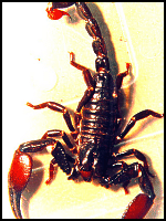 It started out as a joke around the Fallen's grim HQ (and let me tell ya, in the Fallen HQ, a joke is pretty hard to come by). A minor henchman at the dinner table got the bright idea that the Fallen needed a house pet to serve as watchdog and mascot for the team. At about that same time a small scorpion was scuttling across the food upon the table. Seeing the scorpion, another henchman picked up the arachnid by the tail and dangled it before the first henchman. Laughing, he said "Here's yer stinkin' house pet". Across the room, the dark mage Quietus noticed the exchange, and proceeded to cast a spell upon the small scorpion. The scorpion grew to huge size and promptly killed both henchmen, much to the amusement of everyone else in the room. (That was the joke part, there, or what passes for one in the Fallen HQ). As it turns out the scorpion, now called Spot, turned out to be fairly intelligent (for a scorpion) and trainable. Besides the fact that he sometimes gets out and causes havoc and eats the odd lackey, the Fallen have taken to considering Spot the household pet. |